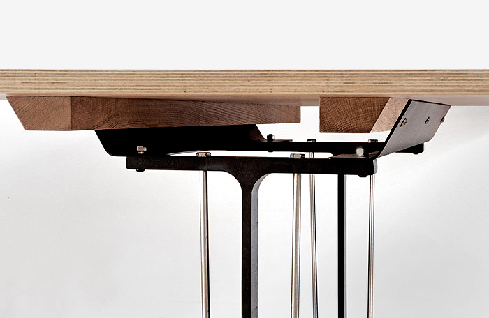 underside of the tabletop and bolt to the steel trestle. They extend beyond